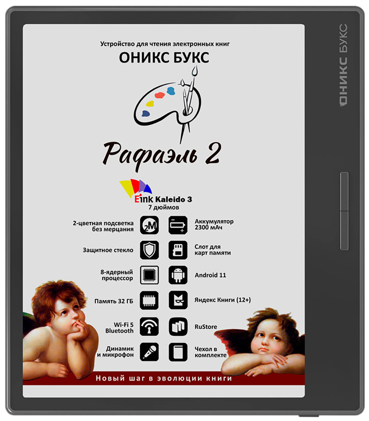 Цветной (4096 цветов) 7-ми дюймовый ёмкостный сенсорный дисплей E Ink Kaleido 3 Разрешение экрана: 1264x1680 (632x840 в цветном режиме), плотность пикселей — 300 ppi (150 ppi в цветном режиме) Защитная обложка в комплекте Микрофон, динамик 8-ядерный процессор, 2 ГГц Cлот для карт памяти microSD ОС Android 11 Оперативная память, 2 ГБ, встроенная память 32 ГБ USB Type-C с поддержкой OTG Wi-Fi, Bluetooth 5.0 Аккумулятор ёмкостью 2300 мАч