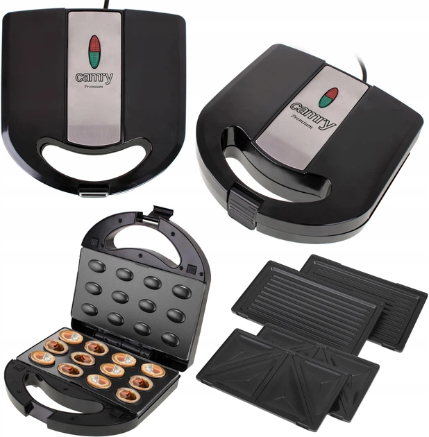 Бутербродниця Camry CR 3063 — компактний універсальний прилад 3в1 для тостів, гриля та печива «орешки», що поєднує швидке приготування і простоту в догляді завдяки змінним знімним пластинам з NON‑STICK покриттям; потужність до 1000 W забезпечує рівномірний нагрів і скорочує час приготування, корпус із нержавіючої сталі з бакелітовими вставками витримує інтенсивне використання, а