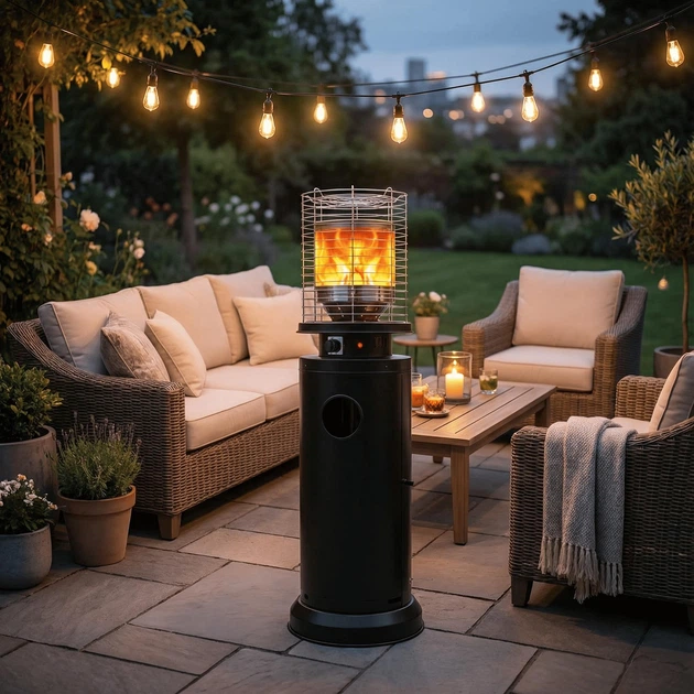 Вуличний газовий обігрівач із регулюванням потужності 13 кВт Gordon з ефектом полум’я та захисною решіткою для обігріву тера