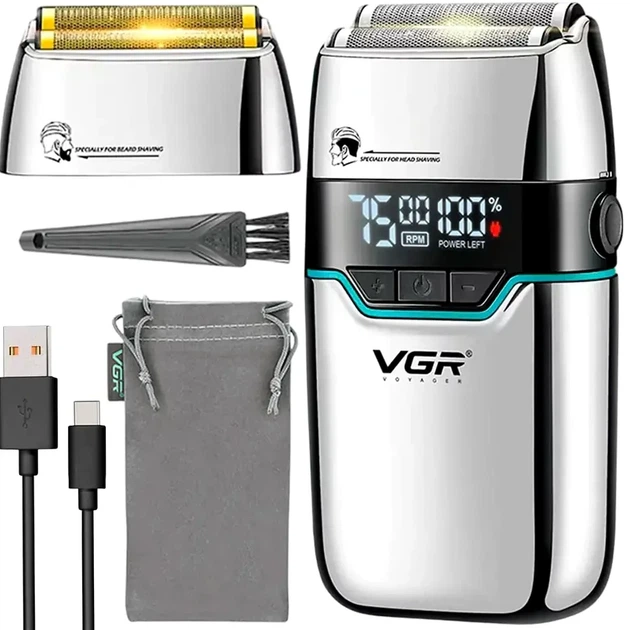 Електробритва з дисплеєм + 2 насадки, 7500об/хв, USB, V-350, Сріблястий / Шейвер для гоління / Бритва