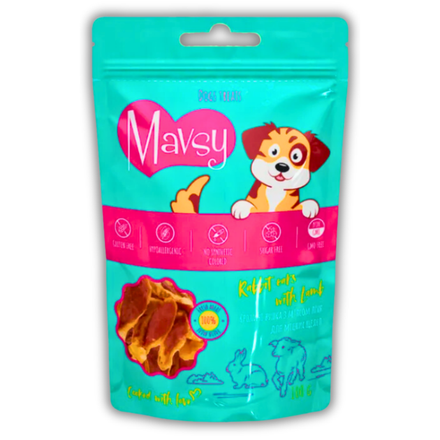 Ласощі для собак Mavsy кролячі вушка з м’ясом ягня 100 г