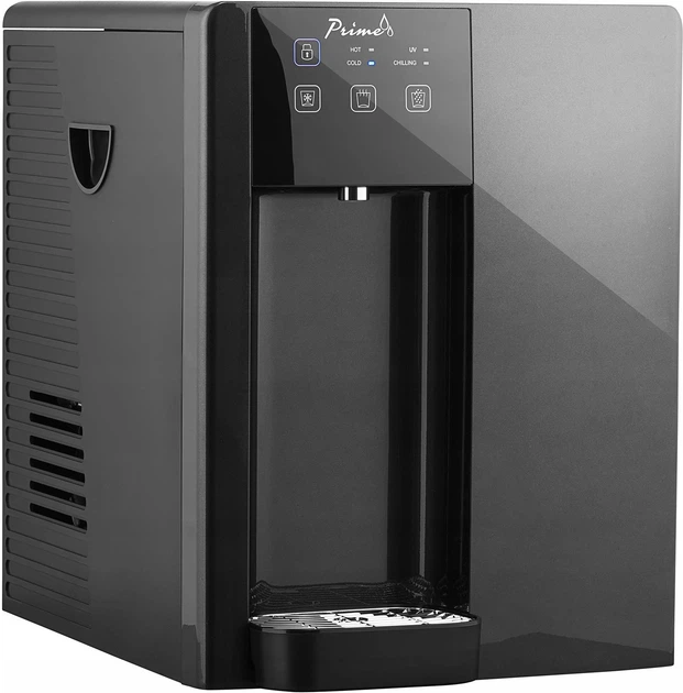 Компактний настільний диспенсер Prime High Class UV Small поєднує сучасний чорний дизайн із професійними функціями для офісу та дому: три режими подачі — холодна (5–12 °C), газована (5–12 °C) та гаряча (~80–85 °C), висока робоча зона 25,5 см для великих судин і сенсорна панель управління з підтримкою утримування подачі; система двоступеневої ультрафільтрації Aquaphor Crystal (0,8 мкм) з вуглецевим елементом
