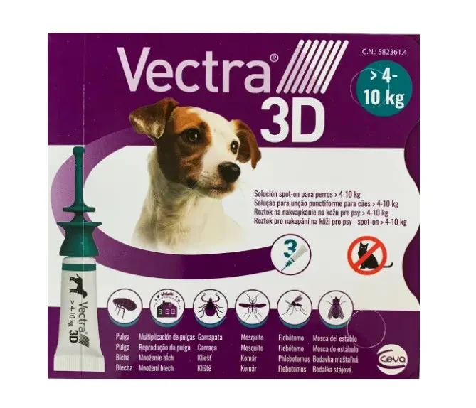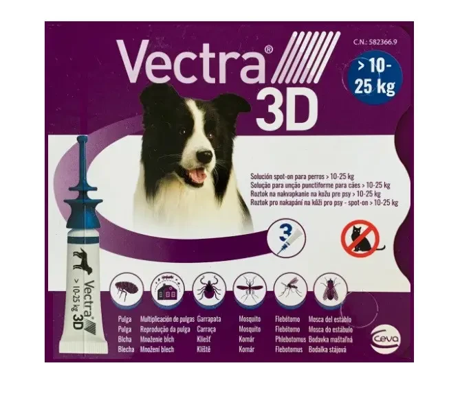 Краплі на холку для собак від бліх, вошей, власоїдів, іксодових кліщів, комарів, москітів, а також для захисту тварин від нападу комах, що паразитують. Лікування алергічного дерматиту, викликаного укусами бліх, рекомендується починати з застосування препарату Vectra 3D. Клінічно доведено ефективність засобу проти коростяних кліщів, вошей, піщаних мушок та інших комах, які паразитують на собаках.