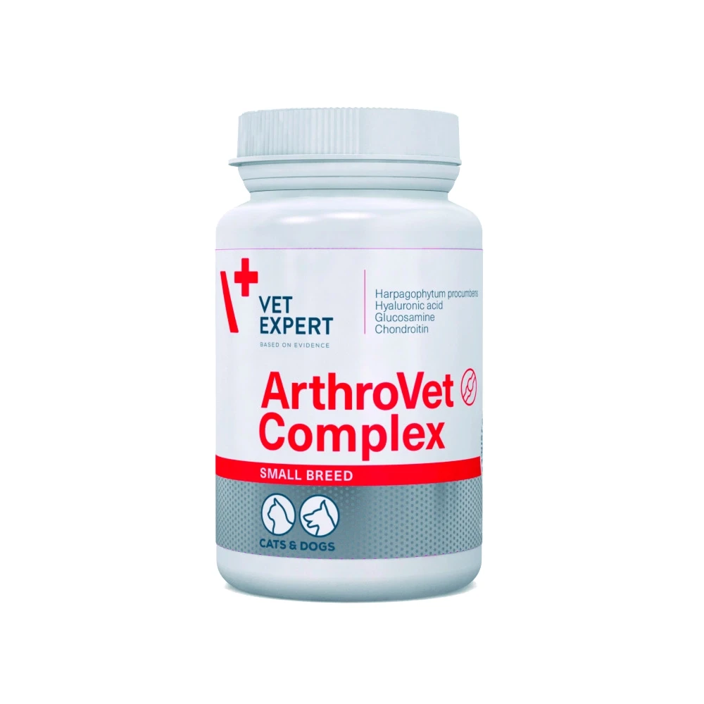 Vet Expert ArthroVet Complex Small breed&cats (Вет Експерт Артровет Комплекс для котів і собак малих порід) – нутрицевтична добавка для котів і собак малих порід із порушеннями функції хрящів і суглобів. Підходить для молодих, дорослих і зрілого віку тварин, особливо при ортопедичних травмах, перед ортопедичними процедурами та у період одужання.