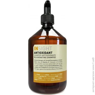 Шампунь тонізувальний для всіх типів волосся Antioxidant Rejuvenating Shampoo Insight має антиоксидантну дію. Захищає волосся від шкідливого впливу довкілля, а бета-каротин, що входить до складу, запобігає накопиченню вільних радикалів. Біоекстракт моркви — потужний антиоксидант. Має унікальну здатність нейтралізувати негативний вплив вільних радикалів. Вітамінізує, живить і зміцнює волосяні