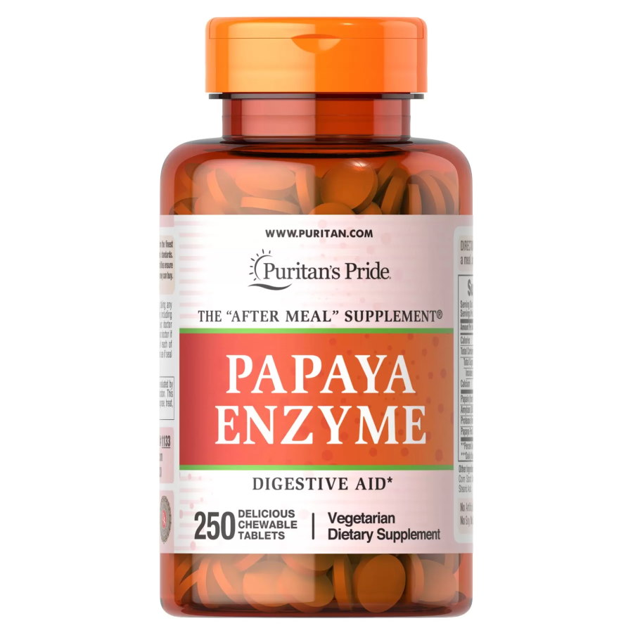 Puritan's Pride Papaya Enzyme - поєднання солодкої папайї з зміцнюючими ферментами, включаючи папаїн, амілазу та протеазу. Міститься в папаї ензим – тат, розщеплює білки. Хімічні зв'язки між білками, яким не дають розпадатися сполучнотканинні волокна, розщеплюються саме папаїном. Ферментне розщеплення речовин у тканинах чи кишечнику найчастіше називається видаленням шлаків. Як