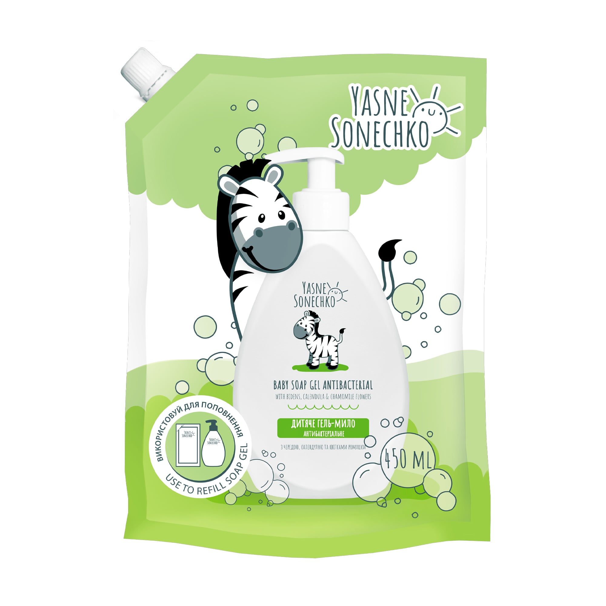 Дитяче гель-мило Ясне Сонечко антибактеріальне, з чередою, календулою та квітами ромашки, 450 мл (дойпак)