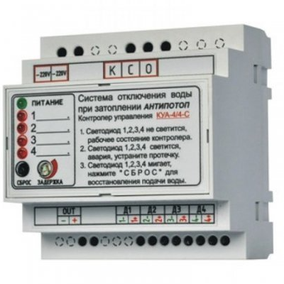 Контролер управління системою захисту від протікання, при аварії систем водопостачання та опалення в побутових, адміністративних та виробничих приміщеннях. При спрацюванні датчика затоплення контролер КУА-4/4-С подає сигнал керування на кульові крани із сервоприводами 632 F+M6A2, 612 F+M6A2 (також доступні інші моделі), які перекривають подачу води. Контролер управління системою