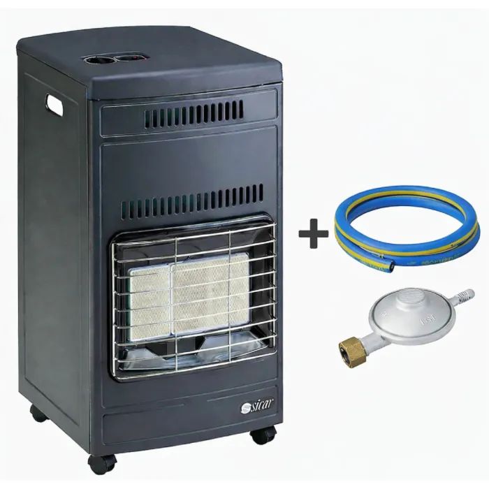 Розміри (см): 64x62x29; Підключення газу (балону): виносне (шланг); Газ-контроль;єзопідпал; П' Термостат; Макс. витрата газу (г/г): 410; Площа обігріву (м²): 40; Плавне регулювання потужності; Потужність нагріву (Вт): 4000; Тип (принцип роботи): конвекторний