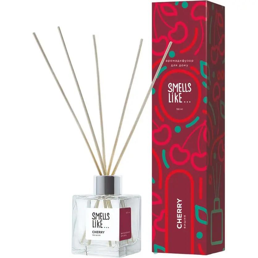 Спосіб застосування/Для дому/офісу|Тип аромату/Фруктовий|Тип кріплення/Настільний|Бренд/Esse|Тип/Аромадифузор|Об`єм, мл/100 мл|Аромат/Вишня|Серія/Smells Like|Комплектація/5 паличок, Флакон із ароматом 100 мл.|Вага, г/Немає|Тематика/Мінімалізм