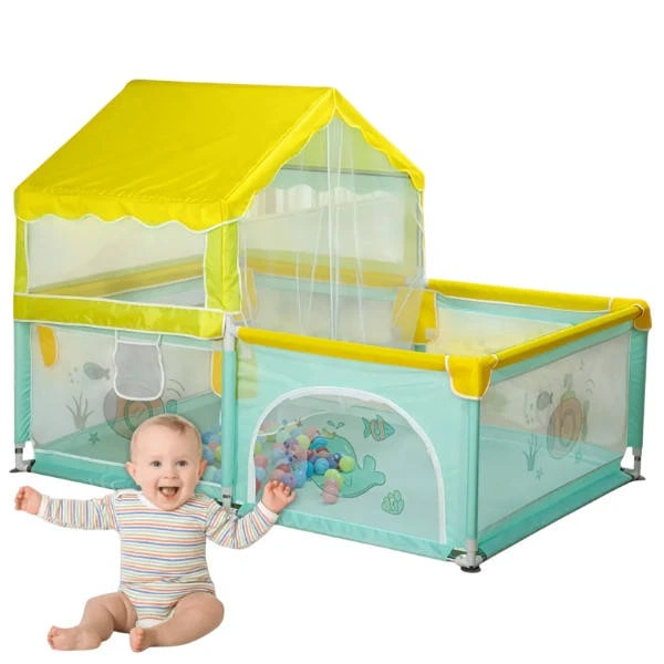 Манеж дитячий ігровий з навісом та москітною сіткою Блакитний з жовтим