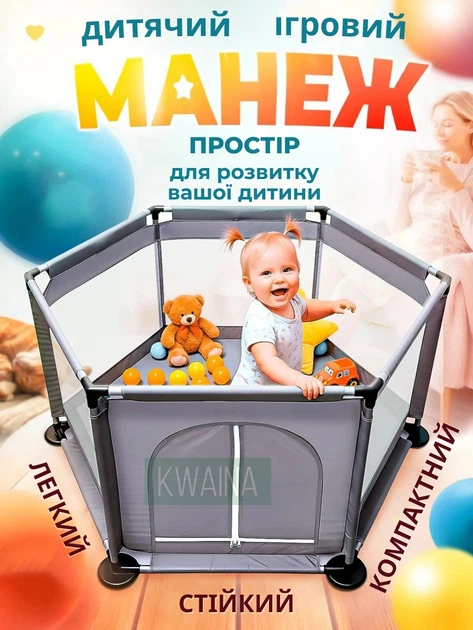 Манеж дитячий ігровий складаний Terrio Happy XL 180х200 см сірий пластикові двері ручки м’ячі манеж-ліжко великий манеж для