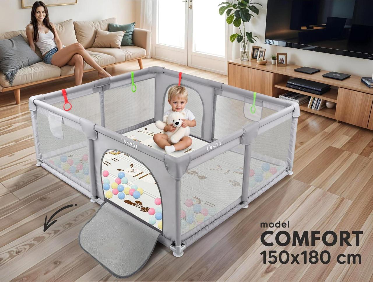 Опис Ігровий манеж огорожа Orsetto Comfort 150×180 см з двостороннім килимком та 50 кульками – надійний простір для безпечних ігор вашої дитини Комплект включає розвиваючий поролоновий килимок товщиною 1 см, ідеально підходить для гри та навчання. Манеж також має чотири ручки , які допоможуть вашій дитині самостійно підтягуватися та робити перші кроки. Крім того, до комплекту входять 50