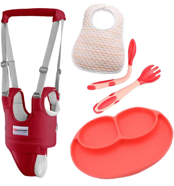 Набір дитячих вожджі-ходунки з підкладками, силіконова ложка-вилка з тарілкою і Пуши кэт з піццою (vol-1975)