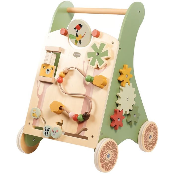 Перші кроки — це завжди хвилююче. Ці дерев'яні ходунки не лише підтримують дитину на шляху до самостійної ходи, а й відкривають перед нею світ пізнання та гри. Яскраві кольори, безпечні матеріали та різноманітні ігрові елементи зроблять кожен день малюка захопливим і корисним. Окрім підтримки під час ходьби, ця іграшка — справжній міні-бізіборд. Вона поєднує в собі навчальні та
