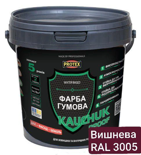 Фарба високоеластична KAUCHUK proof Water Based PROTEX RAL 3005 вишенева 1.3кг