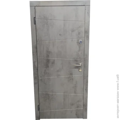 Виробництво: Україна; Покриття зовні: панель МДФ плівка ПВХ; Розмір дверного блоку: 2050x860 мм; Наповнювач: мінеральна вата; Основний замок: циліндричний; Відтінок: бетон сірий;