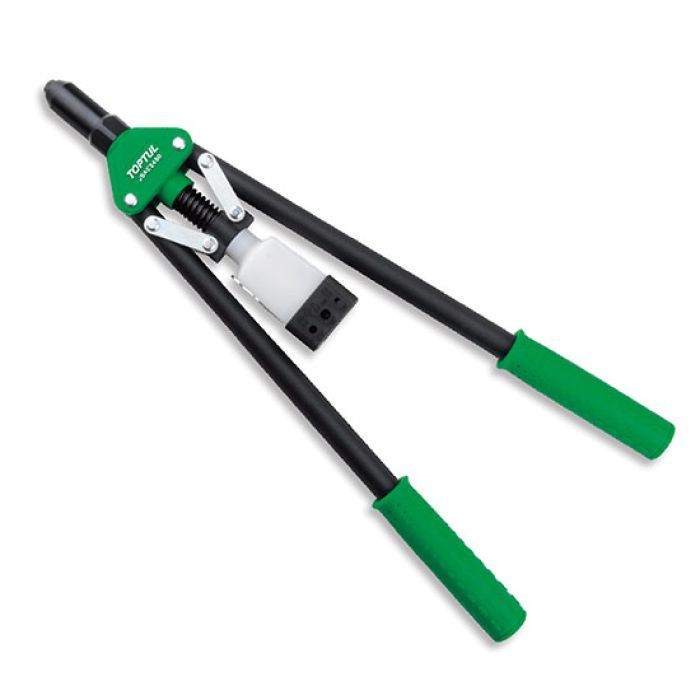Опис заклепника TopTul Pro-Series 2.4-5.0: Інструмент підходить для роботи з заклепками 2.4 мм (3/32"), 3/3.2 мм (1/8"), 4 мм (5/32"), 4.8/5 мм (3/16"), виготовленими з алюмінію, міді, сталі та нержавіючої сталі. Конструкція забезпечує надійну фіксацію заклепки та дозволяє працювати у вертикальному положенні. Міцна пружина та довгий хід дозволяють отримати легкий баланс руху на двох ручках та підвищити стабільність роботи. Важель зменшує фізичне зусилля. У виготовленні корпусу застосовується високоміцний алюміній. Рукоятки виготовлені зі сталевої трубки з гумовим покриттям. Довжина інструменту - 483 мм.