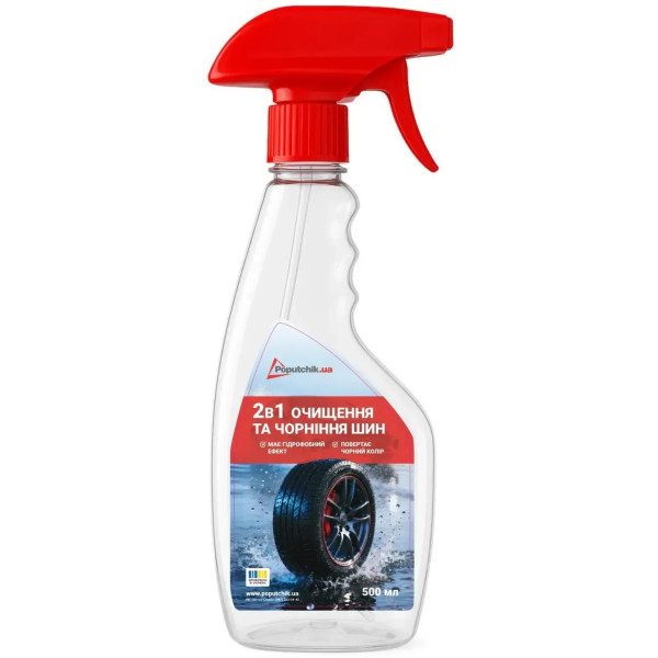 Бренд/Poputchik|Об`єм/0,5 л|Застосування/Блиск, Видалення дорожнього пилу, Чорніння шин|Призначення/Для шин, Для гуми|Консистенція/Готова рідина