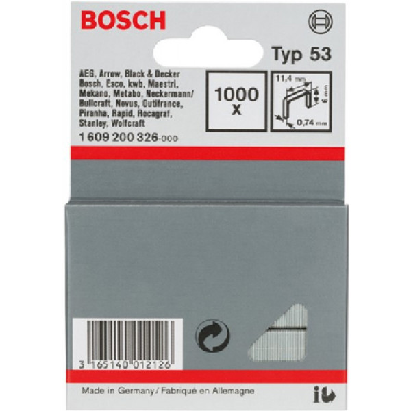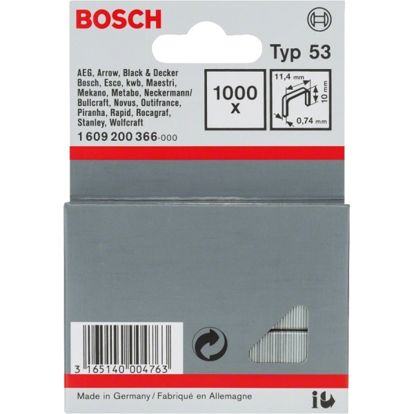 Скоби Bosch тип 53 застосовуються з акумуляторними, електричними і ручними степлерами різних виробників. Мають ширину 11,4 мм і товщину дроту 0,74 мм