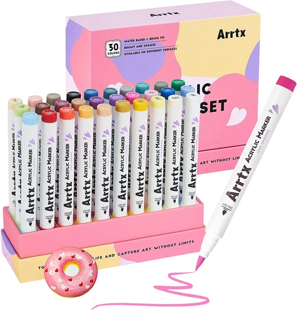 Акрилові маркери Arrtx AACM-0530A 30 кольорів для наскельного живопису, кераміки, скла, дерева та багато іншого. Особливості акрилових ручок Arrtx: - 30 яскравих кольорів: Завдяки різноманітності кольорів на вибір, у вас буде більше можливостей для творчості. Набір маркерів Arrtx із 30 штук - ідеальний вибір для будь-якого художника. - Пензлевий наконечник акрилового маркера: Професійні