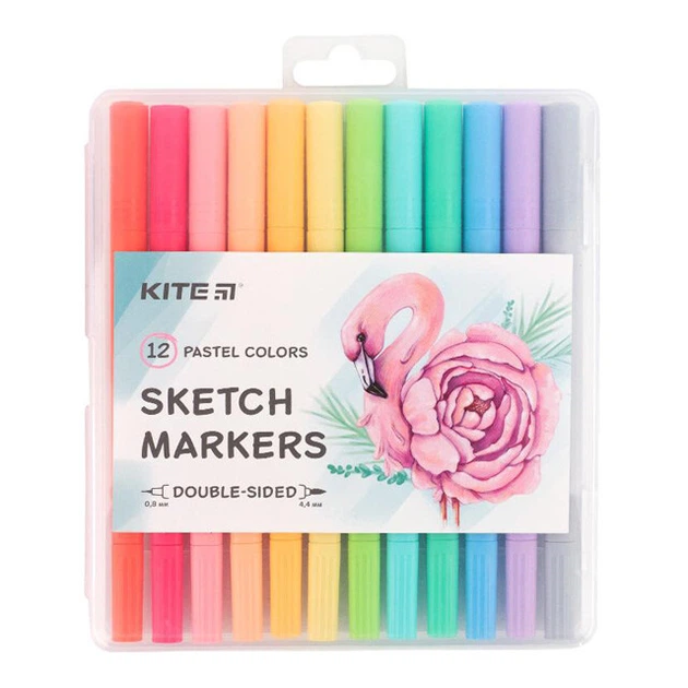 Набір скетч-маркерів Kite Sketch "Pastel" двосторонні 0,8/4,4 мм 12 кольорів в пластиковому пеналі (K22-045)