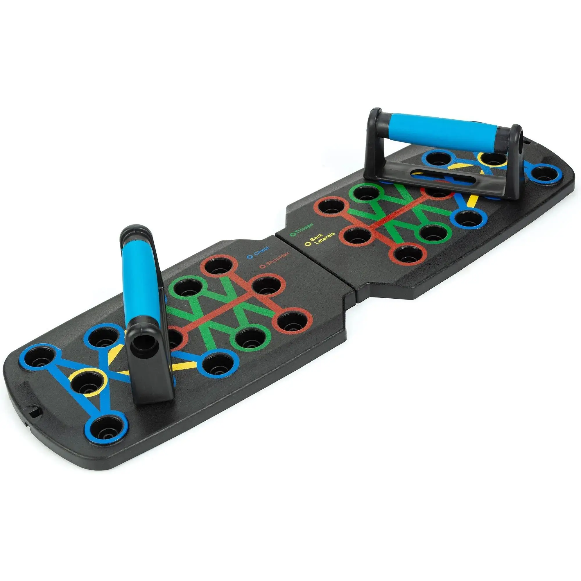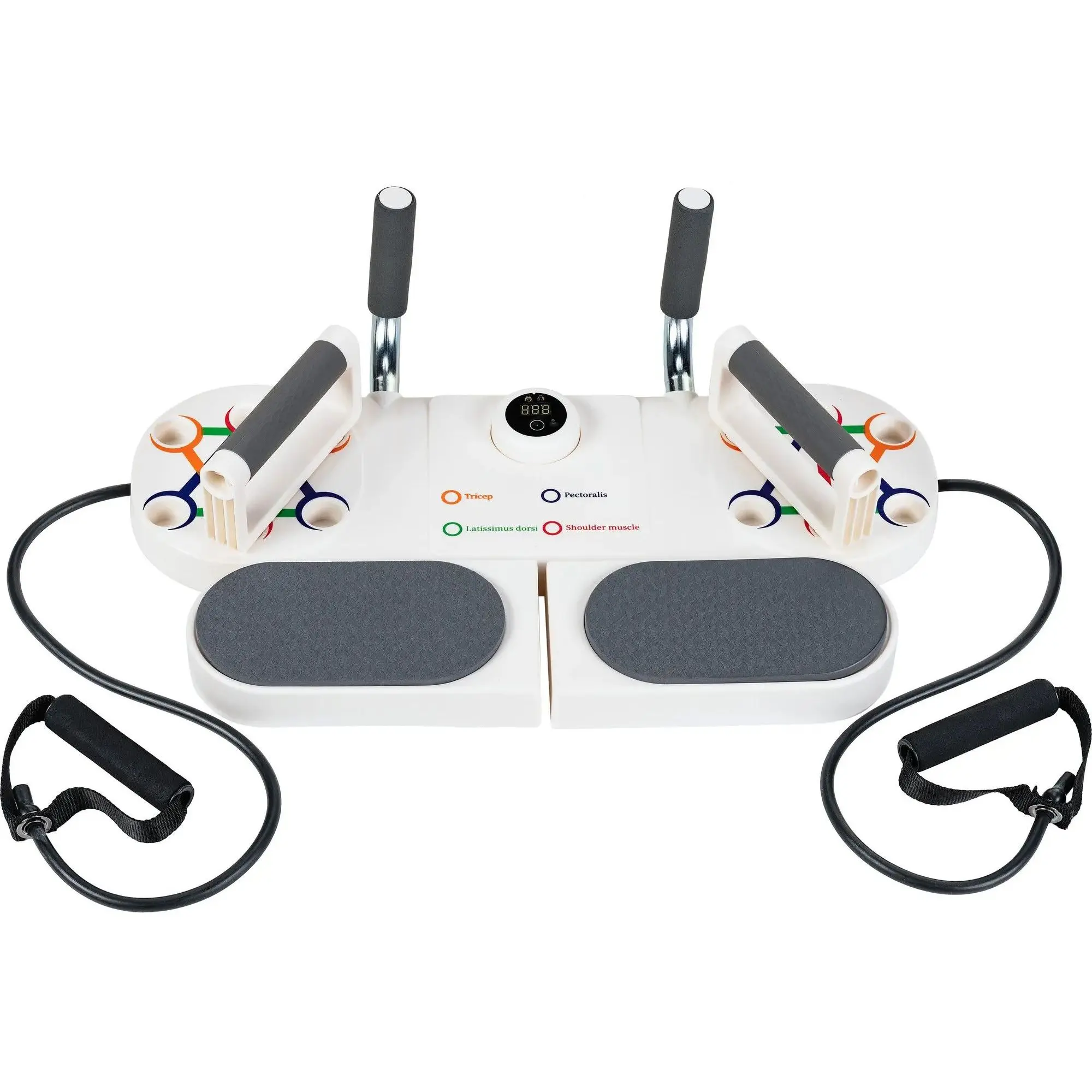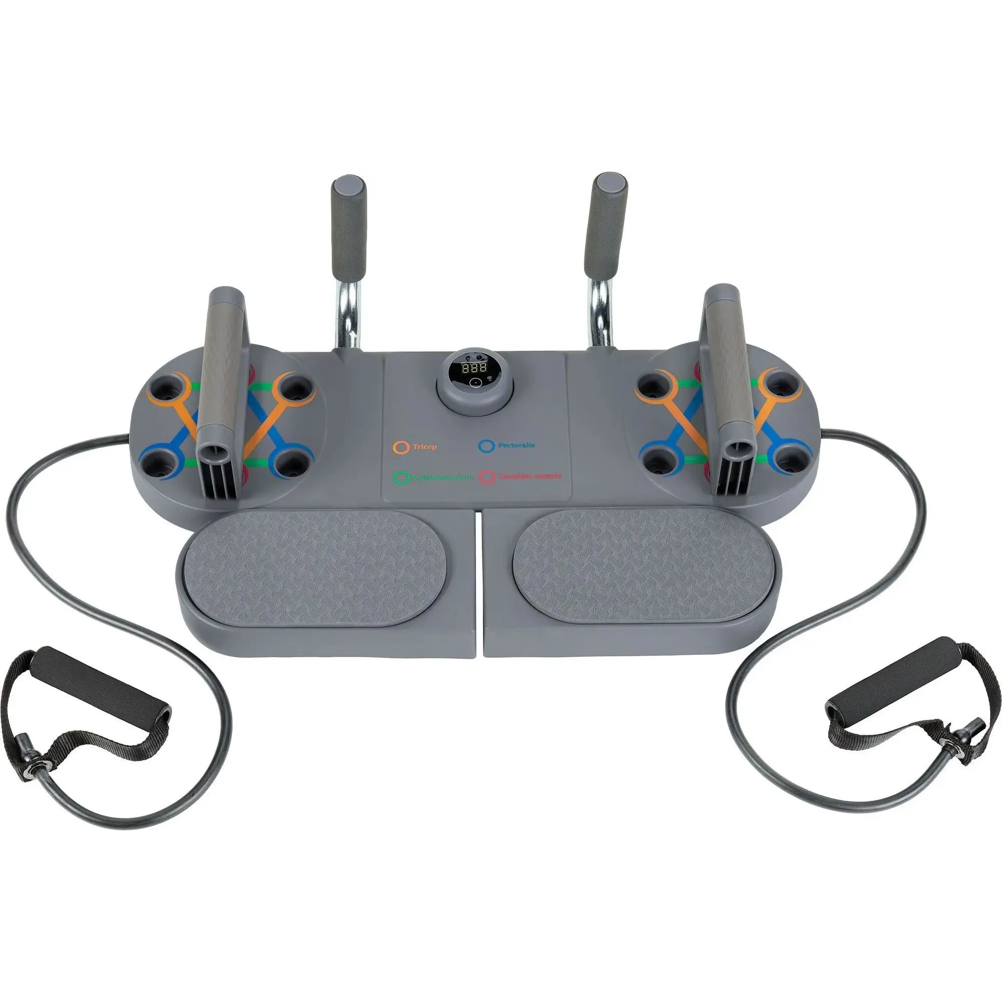 Основні характеристики: У комплекті: дошка 2 опори 10 антиковзких накладок 2 еспандери матеріал: ABS, TPE розмір: 58 х 38 х 15,5 см розміри дошки в складеному вигляді: 58 x 18 x 7 см розміри ручки: 16 см x8,5 см максимальне навантаження: 150 кг вага: 1,6 кг вага з упаковкою: 1,8 кг розмір упаковки: 61 x 20 x 9,5 см розумний лічильник з функцією таймера ручки з нековзним покриттям TPE м'які, потовщені налокітники протиковзкі стабілізуючі ніжки схема отворів для точного розташування ручок вправи, що залучають до 85% м'язів тіла складна конструкція з місцем для зберігання ручок регульована ширина джерело живлення: 2 батарейки типу AAA (не входять до комплекту) гарантія 24 місяці