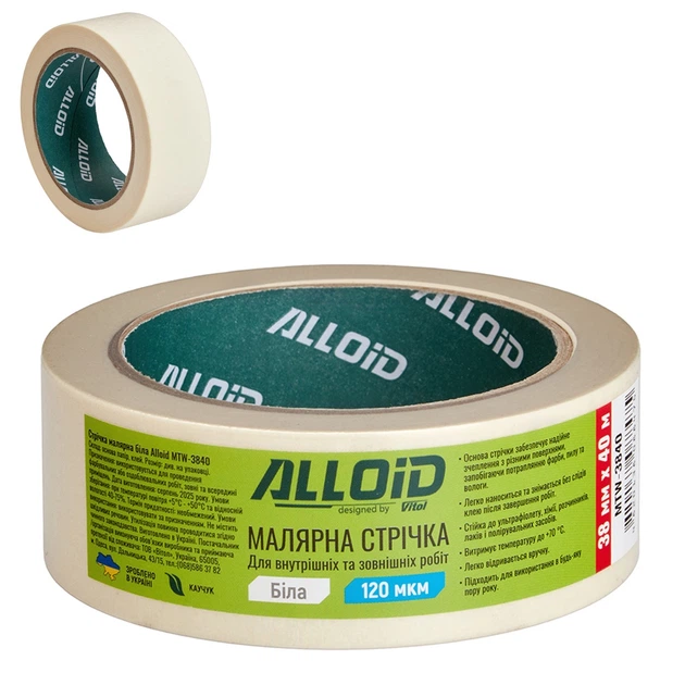 Стрічка малярська біла 38мм х 40м 120мкм Alloid
