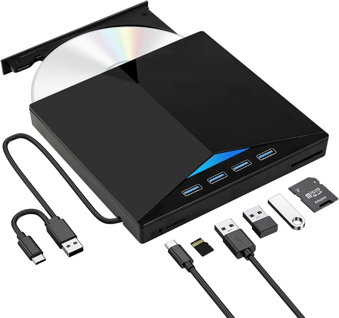 Привід CD DVD зовнішній USB Type-C USB-A хаб з кардрідером microSD SD для ноутбука ПК комп'ютера читання запис дисків портат