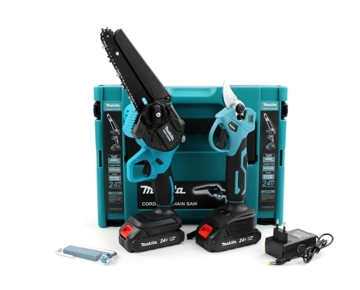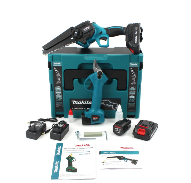 Садовий набір Makita 2в1 24V — ланцюгова пила DUC155Z 15 см + секатор DUP270 Digital , комплект з двома акумуляторами і заря