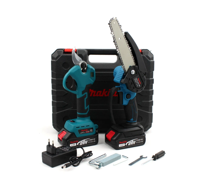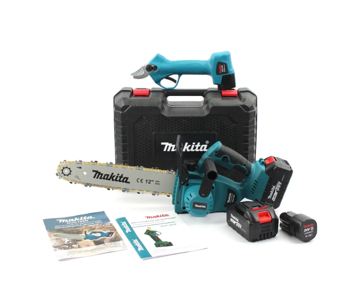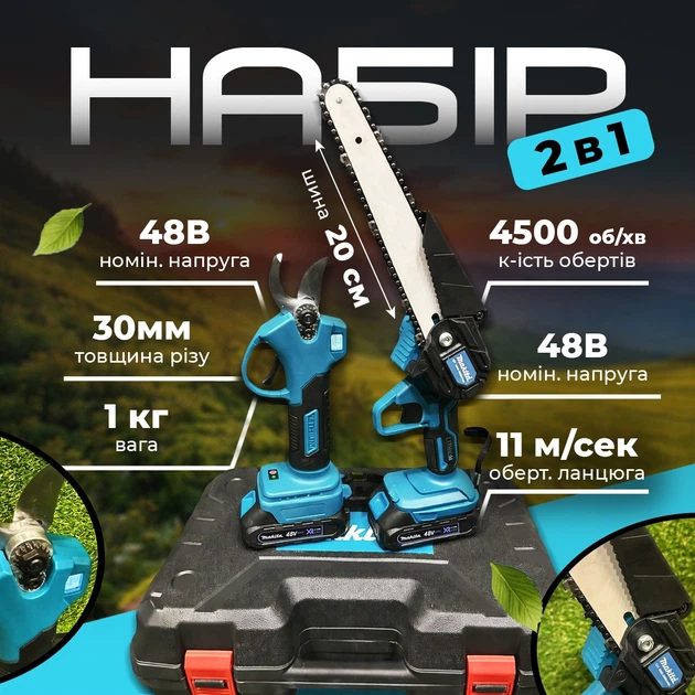 Набір акумуляторних садових інструментів Makita 2в1 48 V мініпила ланцюгова з шиною 20 сантиметрів та секатор з цифровим інд