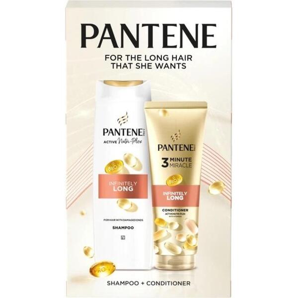 Подарунковий набір по догляду за волоссям Pantene Pro-V Безкінечно довге Шампунь 400 мл + Бальзам-ополіскувач 220 мл. Відкрийте для себе Pantene Pro-V Безкінечно довге — ідеальний набір для живлення, зміцнення та захисту довгого волосся. Формула з Pro-V і технологією Active Nutri-Plex забезпечує глибоке очищення, насичення поживними речовинами та зміцнення структури волосся від коренів до кінчиків. Шампунь дбайливо очищає волосся, не обтяжуючи його, робить пасма міцнішими та блискучими. Бальзам-ополіскувач Miracle збагачений формулою Pro-V, що містить на 50 % більше захисних компонентів, глибоко проникає у волосяне волокно, допомагаючи відновити пошкодження та повернути волоссю природну м’якість і гладкість. Переваги: Відновлення довгого слабкого волосся до останнього сантиметра; Захист молекулярних зв’язків волосся від пошкоджень; До 100 % міцніше волосся* завдяки формулі Pro-V та Active Nutri-Plex; М’яке, блискуче та здорове волосся вже після кількох застосувань; Бальзам-ополіскувач Miracle забезпечує глибоке живлення та захист кінчиків за 3 хвилини.