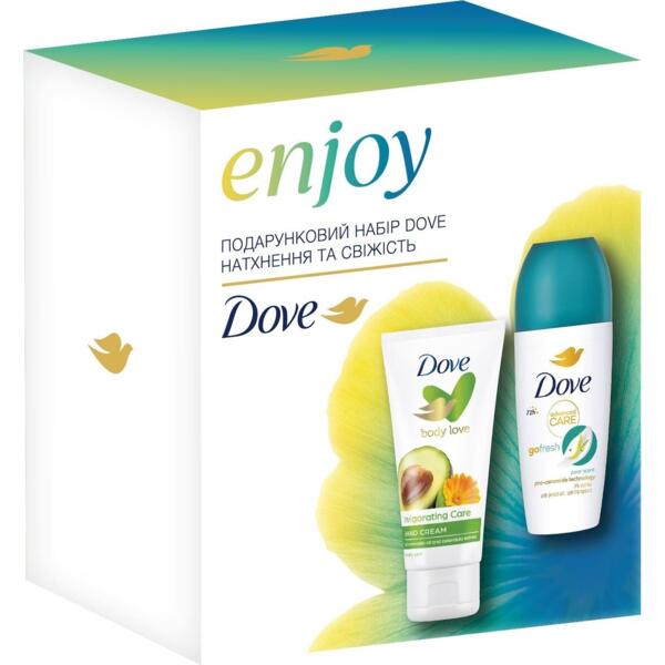 Подарунковий набір натхнення і свіжість Dove — максимальна любов до вашої шкіри. Продукти ідеально підходять для щоденного догляду. Крем для рук Продукт на основі олії авокадо та екстракту календули інтенсивно зволожує шкіру, стимулює відновлення, прискорює загоєння, мінімізує подразнення, надає їй м'якість та еластичність. Як використовувати? Нанесіть засіб на чисту шкіру рук. Використовуйте щоразу, коли відчуєте стягнутість або сухість. Склад: Aqua, Glycerin, Dimethicone, Stearic Acid, Caprylic/Capric Triglyceride, Glycol Stearate, PEG-100 Stearate, Petrolatum, Glyceryl Stearate, Caprylyl Glycol, Parfum, Phenoxyethanol, Cetyl Alcohol, Acrylates/C10-30 Alkyl Acrylate Crosspolymer, Triethanolamine, Disodium EDTA, Stearamide AMP, Carbomer, Tocopheryl Acetate, Persea Gratissima Oil, Glycine Soja Oil, Helianthus Annuus Seed Oil, Calendula Officinalis Flower Extract, Tocopherol, Citronellol, Limonene, Linalool. Кульковий антиперспірант Завдяки інноваційній технології Pro-ceramide засіб ефективно блокує виділення поту протягом 72 годин, нейтралізує неприємний запах, дарує відчуття свіжості та комфорту, залишає приємний фруктовий аромат. Як використовувати? Наносьте на чисту суху шкіру пахв. Не наносьте на пошкоджену шкіру. Склад: Aqua, Glycerin, Aluminum Sesquichlorohydrate, Helianthus Annuus Seed Oil, Steareth-2, Parfum, Steareth-20, Calcium Chloride, Glycine, Disodium EDTA, Pentaerythrityl Tetra-di-t-butyl Hydroxyhydrocinnamate, Glycine Soja Oil, Calendula Officinalis Flower Extract, Tocopherol, Amyl Salicylate, Benzyl Alcohol, Benzyl Salicylate, Citronellol, Dimethyl Phenethyl Acetate, Hexyl Cinnamal, Linalool, Linalyl Acetate, Tetramethyl Acetyloctahydronaphthalenes, Trimethylcyclopentenyl Methylisopentenol.