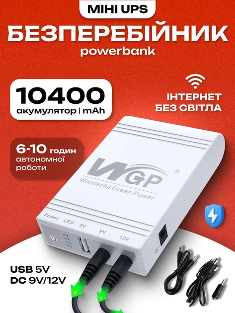 Джерело безперебійного живлення для роутера Mini UPS WGP чорний 10400 mAh 2xDC 12V-1A 9V-1A 1хUSB 5V