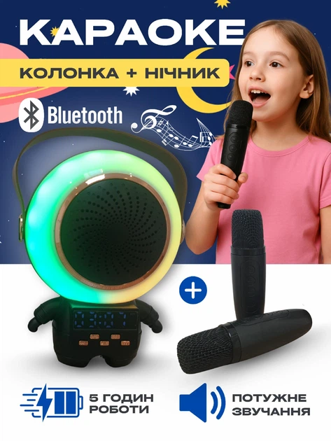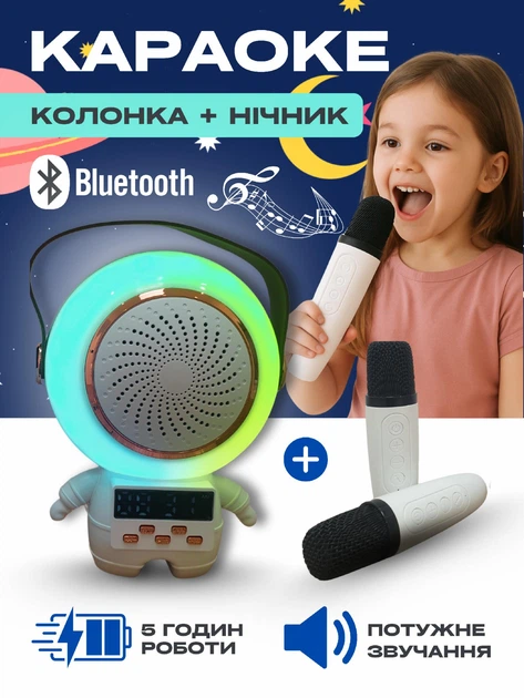 Дитячий набір караоке портативна Bluetooth колонка нічник співаючий Космонавт музичний центр з двома бездротовими мікрофонам