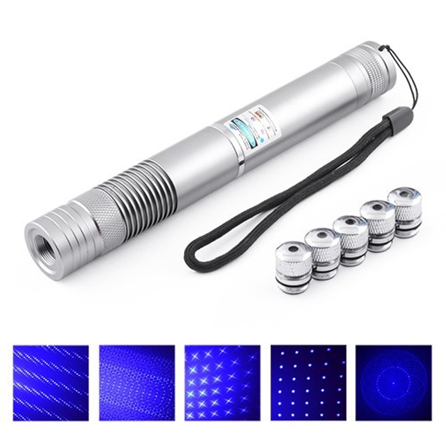 Акумуляторна лазерна указка синій лазер YXB 008 на 5 насадок Silver