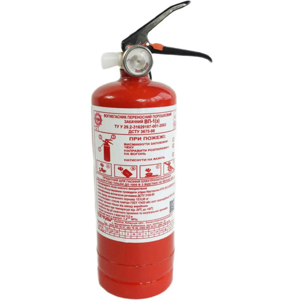 Вид - балон, Тип - порошковий, Маса вогнегасної речовини - 1 кг, Клас гасіння - A, B