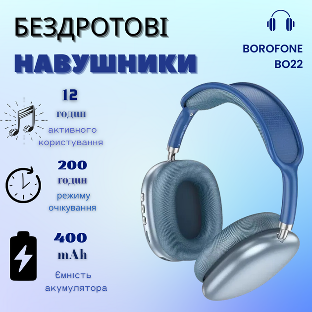 Бездротові накладні навушники для телефону з мікрофоном хорошим звуком повнорозмірні блютуз сині Borofone