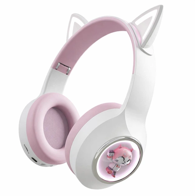 Бездротові накладні навушники Cat YDM56 з LED-підсвічуванням і котячими вушками, 40 мм, складні, Біло-рожеві