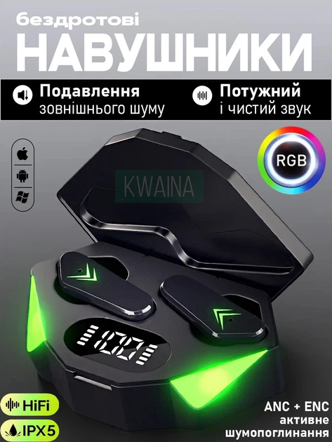 Бездротові блютузи навушники з LED підсвічуванням ігрові з мікрофоном, Bluetooth 5.0, кейс-повербанк індикація заряду 1200 м