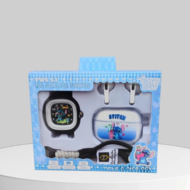 Дитячий подарунковий набір зі Стичем 4 в 1 бездротові Блютуз навушники кейс для заряджання брелок Stitch і дитячий годинник
