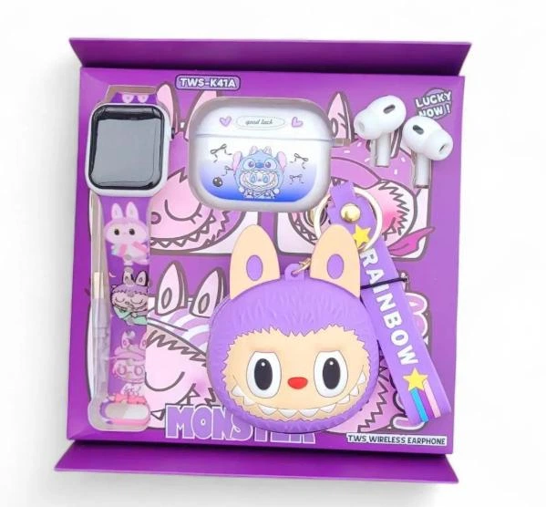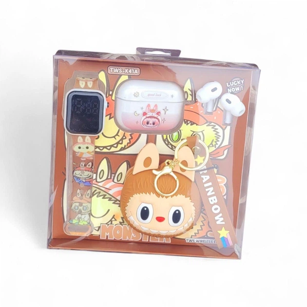 Дитячий подарунковий набір 4 в 1 Лабубу для дівчинки, бездротові блютуз навушники, чохол для навушників, дитячий годинник ла