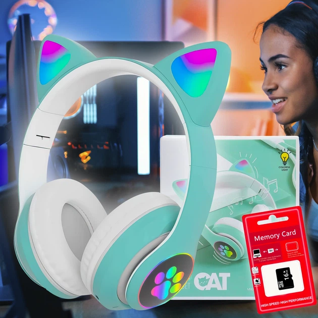 Бездротові портативні bluetooth TWS навушники з котячими вушками Cat STN-28 + SD карта пам'яті 16 Гб Бірюзові