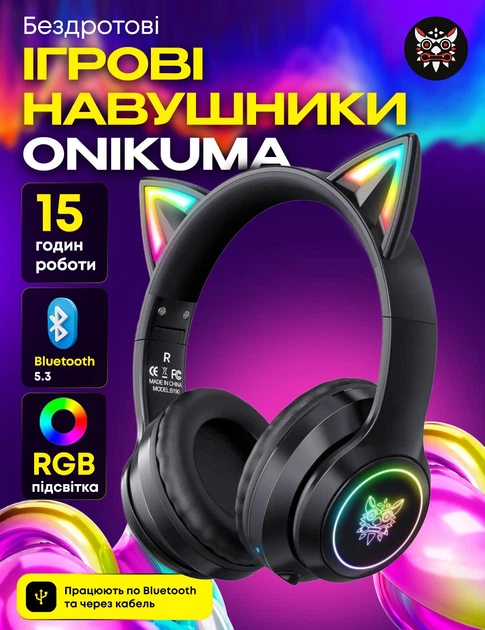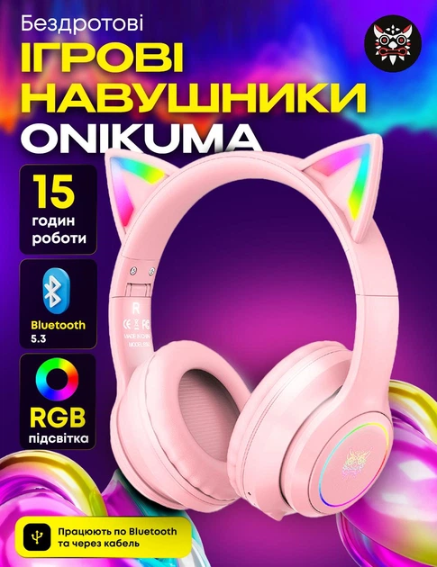 Ігрові Bluetooth навушники Onikuma з котячими вушками, RGB підсвіткою та мікрофоном Бездротові навушники для геймерів та стр