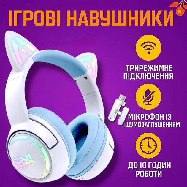 Бездротові ігрові навушники Onikuma, Bluetooth 5.3, трирежимні 2.4GHz/USB, з мікрофоном, RGB-підсвіткою та котячими вушками