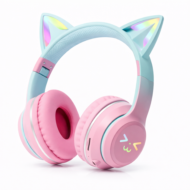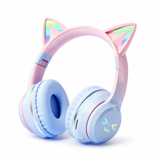 Дитячі бездротові навушники CATEAR BT618 з вушками та RGB-підсвіткою Bluetooth 5.3 MicroSD AUX Синьо-рожеві