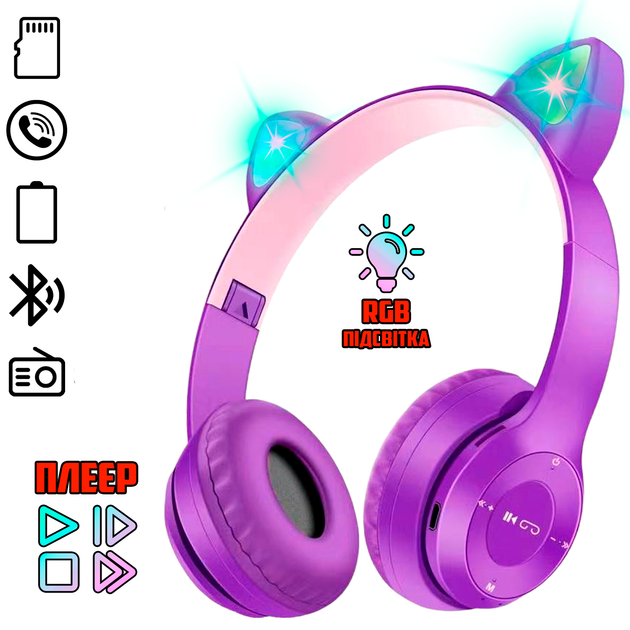 Бездротові навушники Bluetooth з вушками кішки CAT-ХY зі світлодіодним підсвічуванням, складні MicroSD Violet