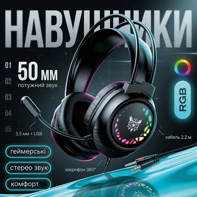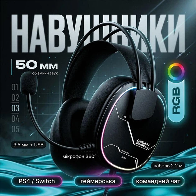 Ігрові навушники провідні Onikuma X91 з мікрофоном та RGB підсвічуванням |3.5mm+USB, PS4/Switch| Black