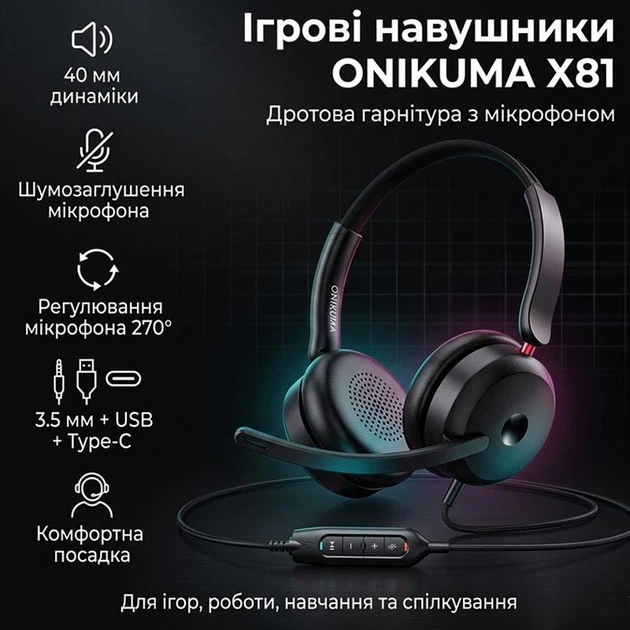 Ігрові навушники провідні Onikuma X81 з мікрофоном|3.5mm+USB/Type-C| Black