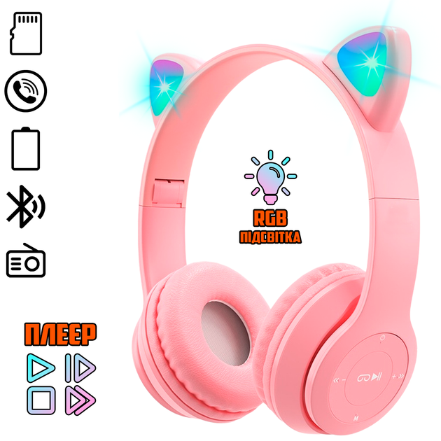 Бездротові Bluetooth навушники для дітей дитячі AKS-28 з котячими вушками, що світяться, LED RGB підсвічуванням, Pink